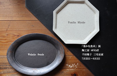 「豊かな食卓」展 陶工房 ゆうらぼ 千田稚子 三宅史家 2020.7.22〜8.2 おうちごはんを豊かな時間に。 お気に入りのお皿が並ぶ食卓は、心がほっと和んで お腹も心も満たされます。